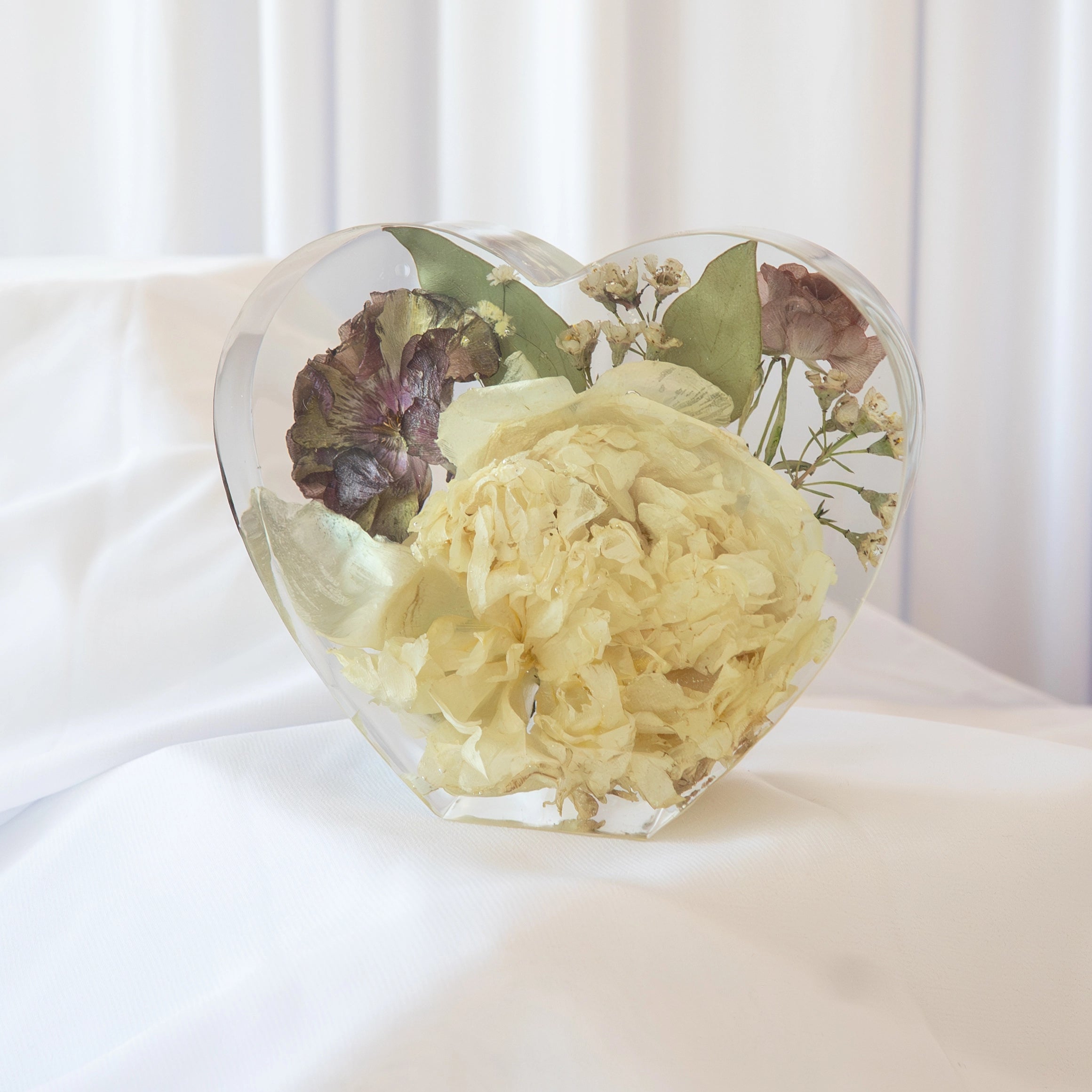 Hand-cast in crystal-clear PetalSafe™ resin, this charming piece features a flat bottom that allows it to stand gracefully on its own. Display it on a nightstand, vanity, desk, or mantle—a heartfelt addition that adds a touch of love to any space.