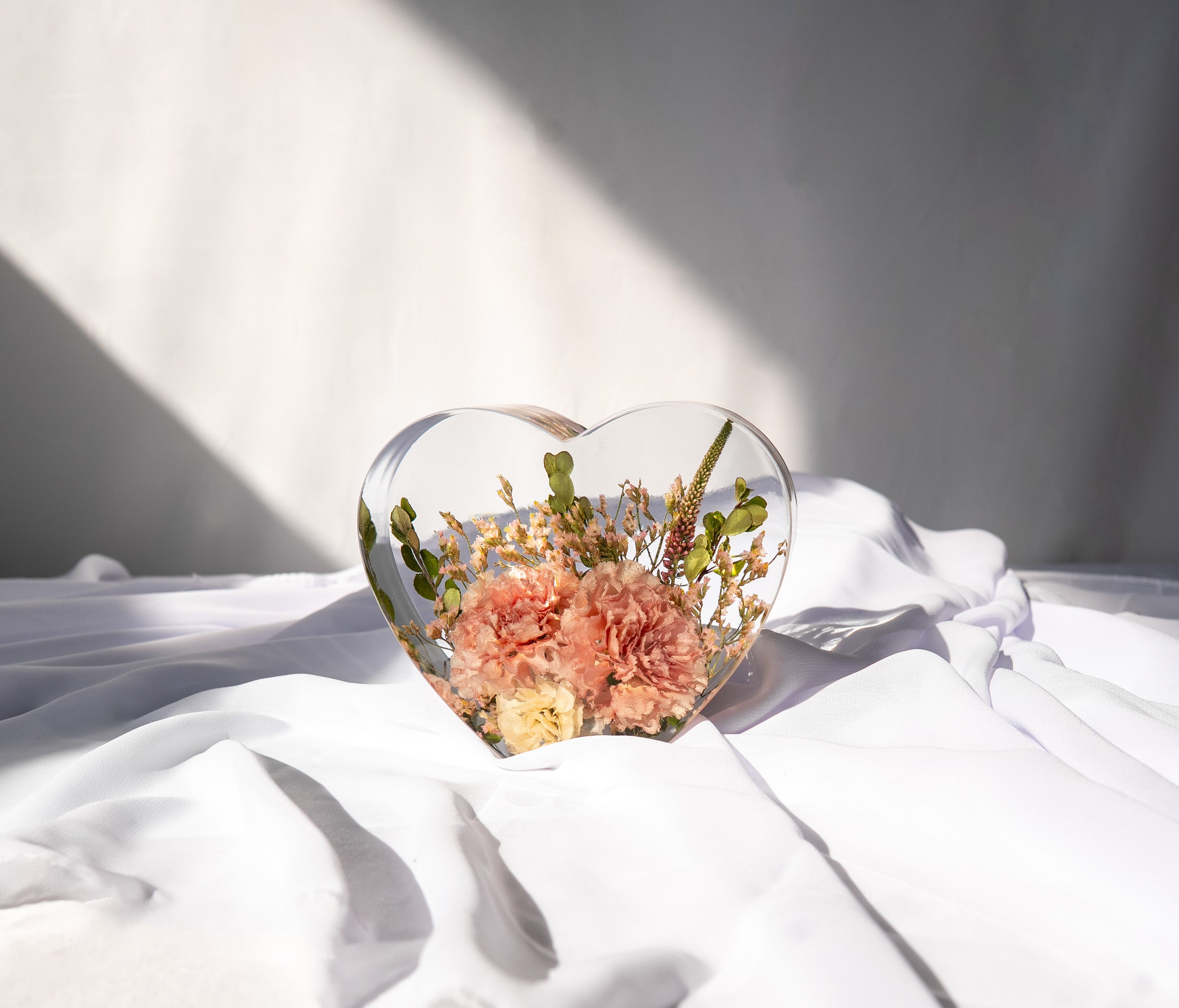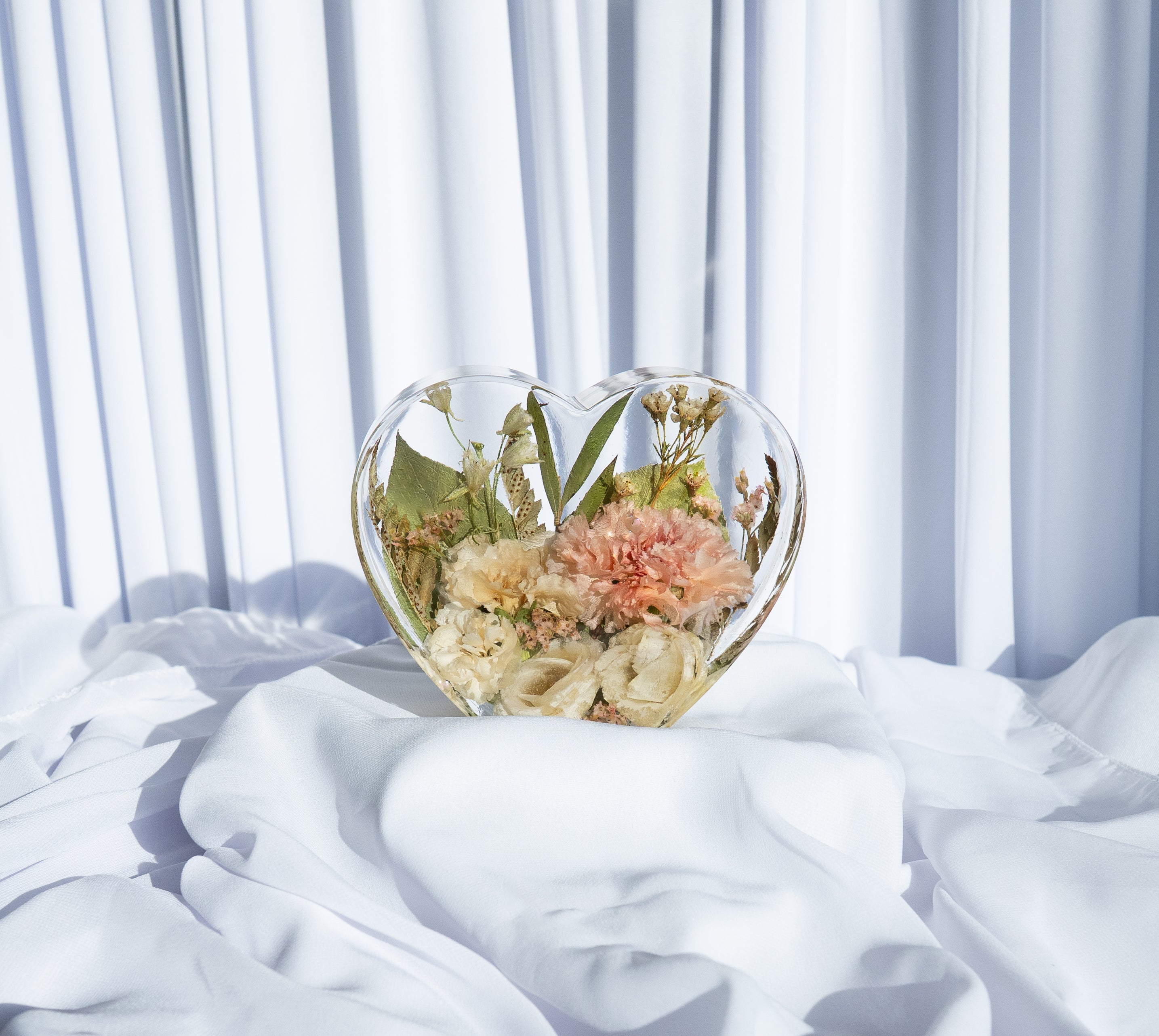 Hand-cast in crystal-clear PetalSafe™ resin, this charming piece features a flat bottom that allows it to stand gracefully on its own. Display it on a nightstand, vanity, desk, or mantle—a heartfelt addition that adds a touch of love to any space.